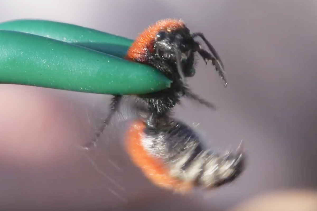 On vous a évité les 8 premières minutes où en fait le mec explique que la Fourmi Velours alias la Tueuse de Vache (rien que le nom vous susurre « barre toi » au fond du cerveau), est l’insecte dont la piqure est la plus douloureuse qui soit, bien qu’elle ne soit pas mortelle. Nous remercions ce crétin pour cet exemple de bravoure inutile au premier abord mais riche d’enseignement, grâce à lui, je peu vous assurer que je ne m’approcherai jamais de cette belle fourmi ! Et à part ça, vous croyez que ça ferait une bonne mouche ou que les truites savent elles aussi que ce machin vous fait un mal de chien ?