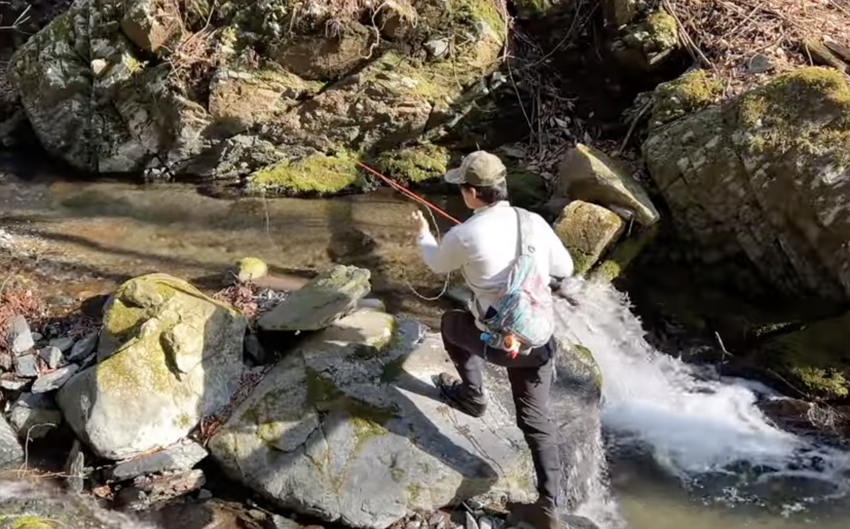 On adore ça, les petits ruisseaux. D’abord tu peux t’y perdre et si tu pêches à deux, en tandem, y’en a un qui pêche, l’autre le suit et quand le premier à fait un poisson, l’autre le remplace, et ainsi de suite ! Là c’est différent, Roy (le mec de la chaine Roy’s Fishing) y va tout seul et s’éclate comme un enfant ! C’est exactement le genre de film qui te stimule pour prendre ta canne et remonter un petit ruisseau toi aussi. Vous avez vu sa canne ? 5pieds8 en soie de 3 ! Avec un bas de ligne de la même longueur ! Le bonheur absolu. Ça nous change des rivières si large que te ne peux pas arriver à la berge d’en face sans te foutre en wading jusqu’à la taille. Là, c’est plus simple, tu vises les courants et les poches d’eau, ta mouche elle « pêche » sur 20, 30 centimètres, dans le meilleur des cas elle va prendre la veine sur 1m. Tes sens sont au maximum, tu entends les oiseaux, tu respires l’air de la forêt, tu es tout seul, concentré sur ta mouche, ton lancer. Le bonheur absolu !